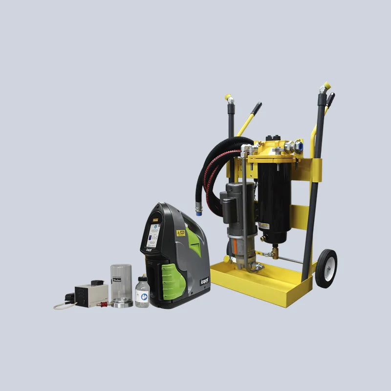 - Sistemas de filtración portátil para filtrar o transportar aceite nuevo y contaminado. Diseñados para un tratamiento en sitio, extienden la calidad de uso del aceite y protege los componentes hidráulicos. Equipos con capacidad de 4, 5,10, 20 y 40 GPM, deshidratadoras, removedores de agua y barniz.
