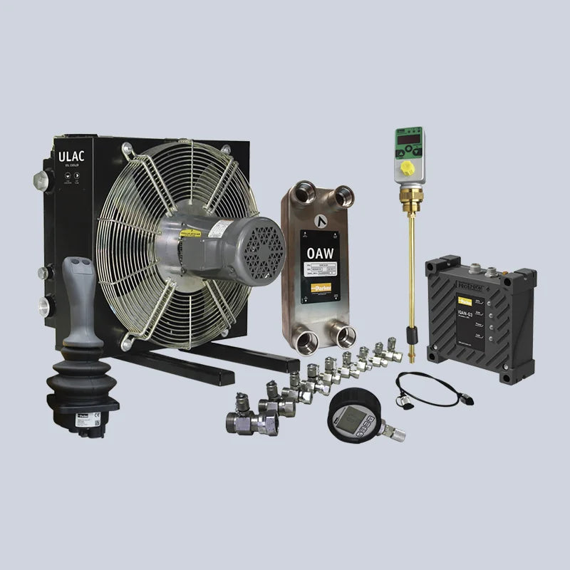 - Intercambiadores de calor - Aire con motor hidráulico con bomba de un flujo máx. 80LPM, máximo enfriamiento de 112. KW/°C, instalación en paralelo de la unidad hidráulica para recirculación o con motor Hidráulico con un enfriamiento máximo de 6.8KW/°C, velocidad máxima 3500RPM.