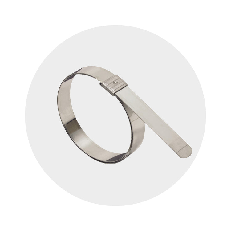 Fleje de abrazadera: acero inoxidable serie 300 Hebillas: Acero inoxidable serie 302.
