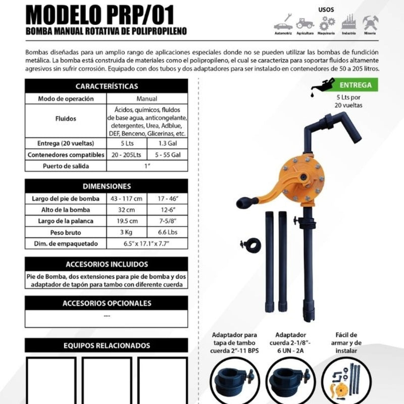 Bombas disenadas para un amplio rango de aplicaciones especiales donde no se pueden utilizar las bombas de fundicion metalica. La bomba esta construida de materiales como el polipropileno, el cual se caracteriza para soportar uidos altamente agresivos sin sufrir corrosion. Equipado con dos tubos y dos adaptadores para ser instalado en contenedores de 50 a 205 litros