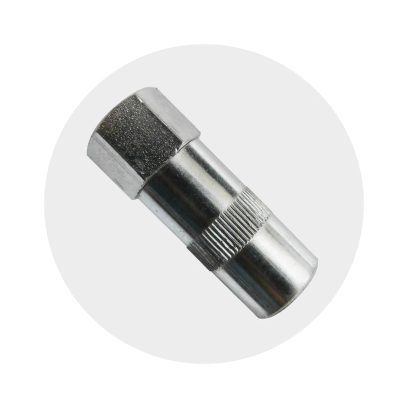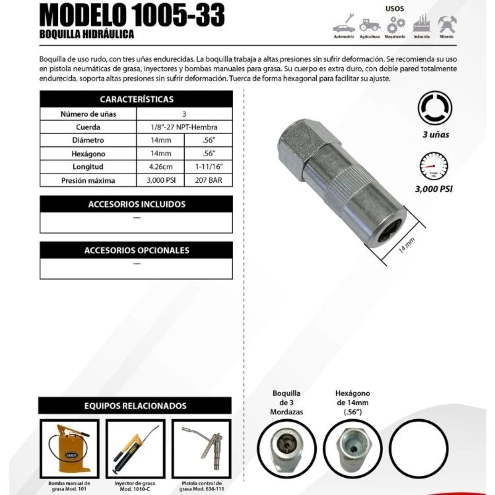 Boquilla de uso rudo, con tres unas endurecidas. La boquilla trabaja a altas presiones sin sufrir deformacion. Se recomienda su uso en pistola neumaticas de grasa, inyectores y bombas manuales para grasa. Su cuerpo es extra duro, con doble pared totalmente endurecida, soporta altas presiones sin sufrir deformacion. Tuerca de forma hexagonal para facilitar su ajuste.