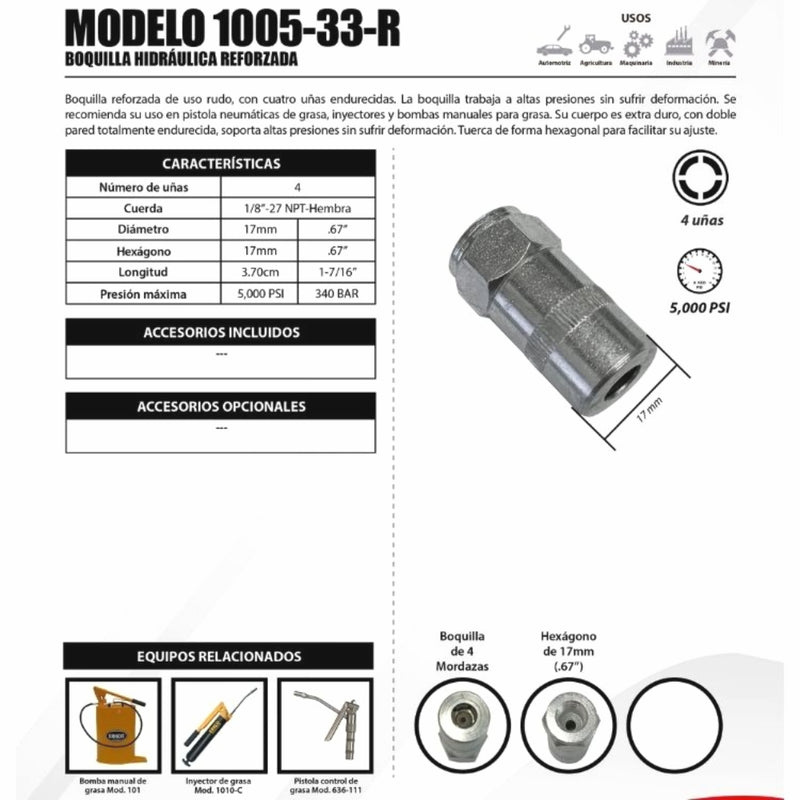Boquilla reforzada de uso rudo, con cuatro unas endurecidas. La boquilla trabaja a altas presiones sin sufrir deformacion. Se recomienda su uso en pistola neumaticas de grasa, inyectores y bombas manuales para grasa. Su cuerpo es extra duro, con doble pared totalmente endurecida, soporta altas presiones sin sufrir deformacion. Tuerca de forma hexagonal para facilitar su ajuste.