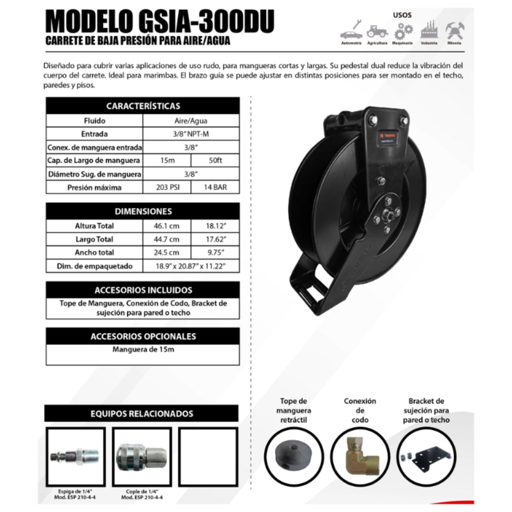 Disenado para cubrir varias aplicaciones de uso rudo, para mangueras cortas y largas. Su pedestal dual reduce la vibracion del cuerpo del carrete. Ideal para marimbas. El brazo guia se puede ajustar en distintas posiciones para ser montado en el techo, paredes y pisos.