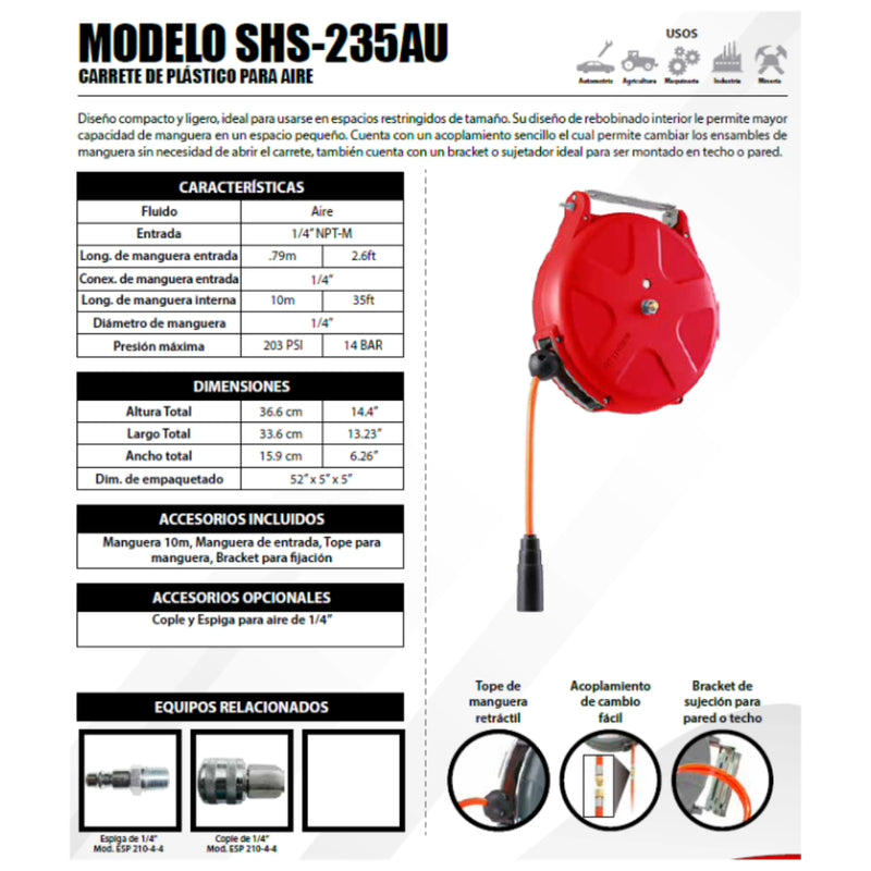 Diseno compacto y ligero, ideal para usarse en espacios restringidos de tamano. Su diseno de rebobinado interior le permite mayor capacidad de manguera en un espacio pequeno. Cuenta con un acoplamiento sencillo el cual permite cambiar los ensambles de manguera sin necesidad de abrir el carrete, tambien cuenta con un bracket o sujetador ideal para ser montado en techo o pared.
