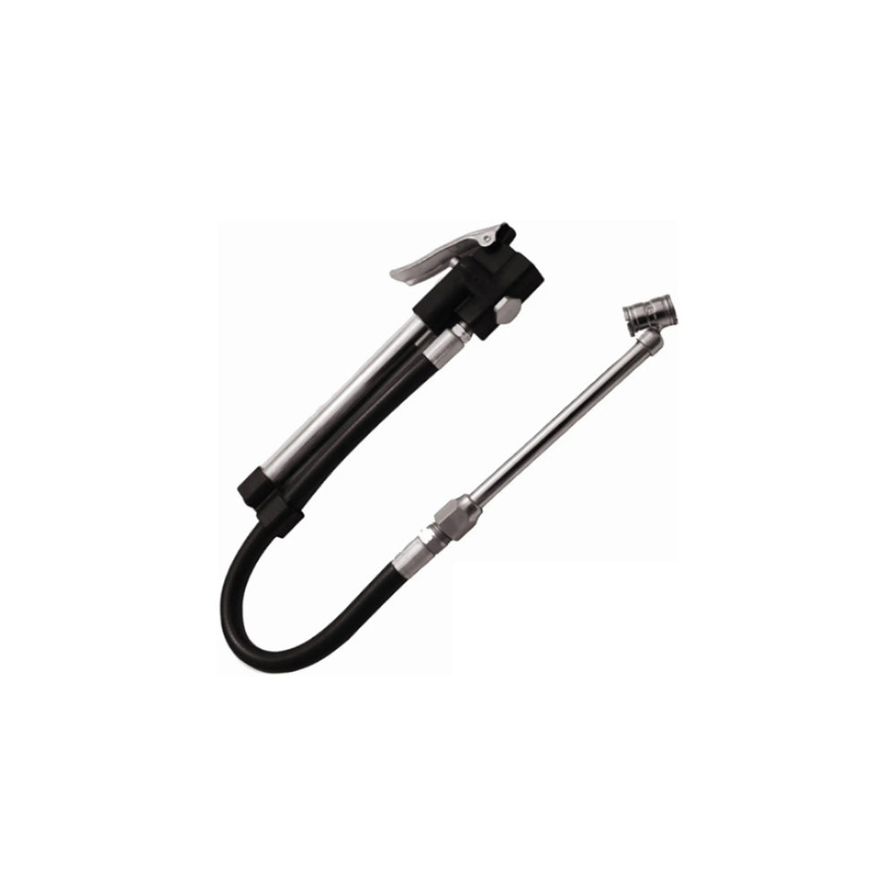Calibrador e inflador de llantas, con cuerpo de nylon y manguera de 340 mm; cabezal doble, capacidad de 10 a 150 PSI, con incrementos de 2 PSI, da lecturas con una precision de 2 PSI. Rosca hembra de 1/4-18 NPTF.