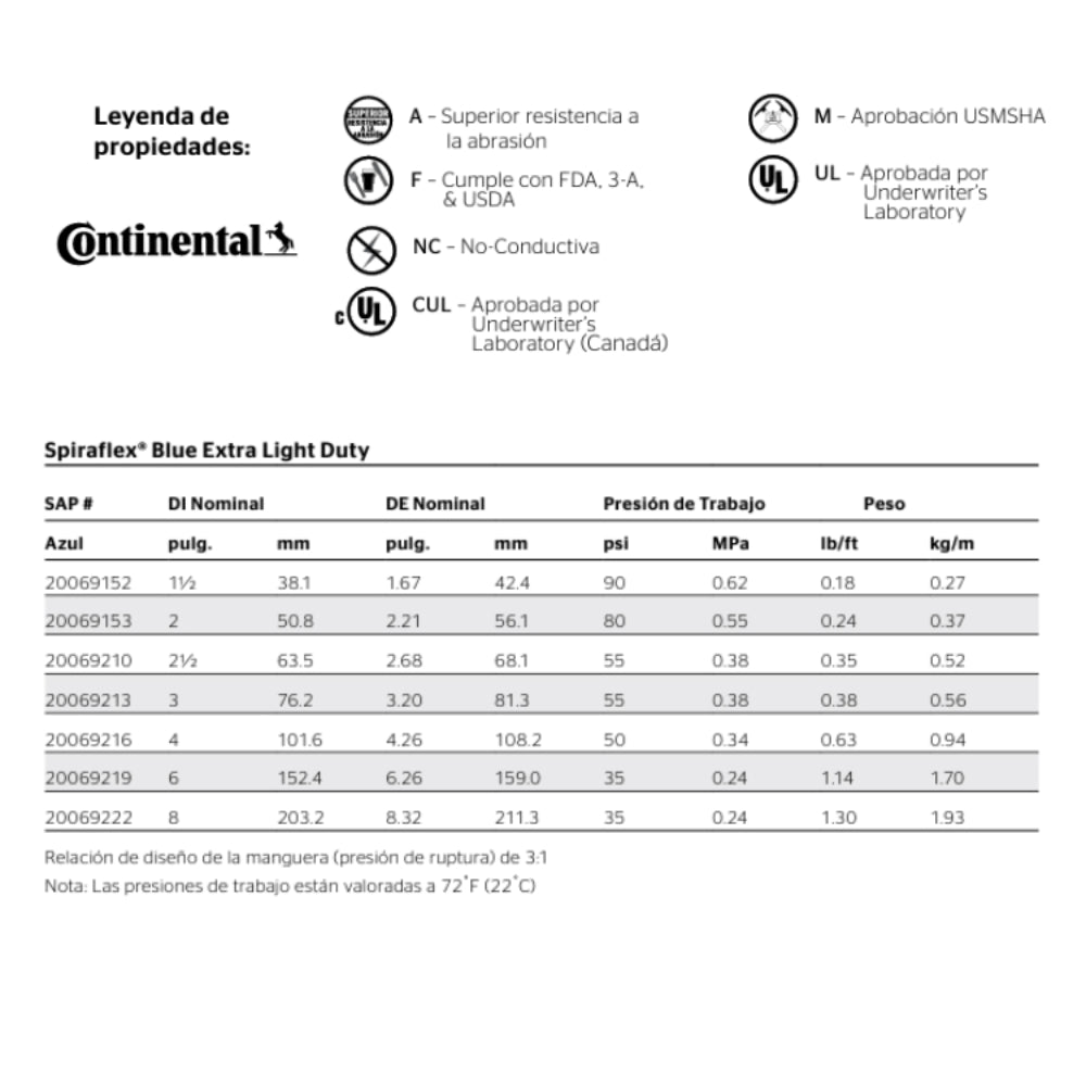 La manguera SPIRAFLEX Azul de Continental está diseñada para aplicaciones industriales exigentes, ofreciendo resistencia y durabilidad superiores. Su construcción robusta garantiza un rendimiento confiable en entornos industriales variados, asegurando seguridad y eficiencia en el manejo de fluidos.